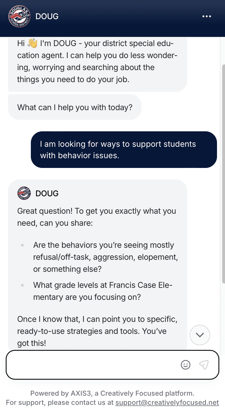 Enter DOUG, the district’s closed-source AI agent built in partnership with Creatively Focused.